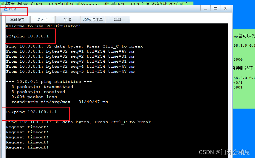 (PC1无法ping通PC2,PC2的icmp包可以到达PC1但是到路由器G0/0/0口会被过滤)