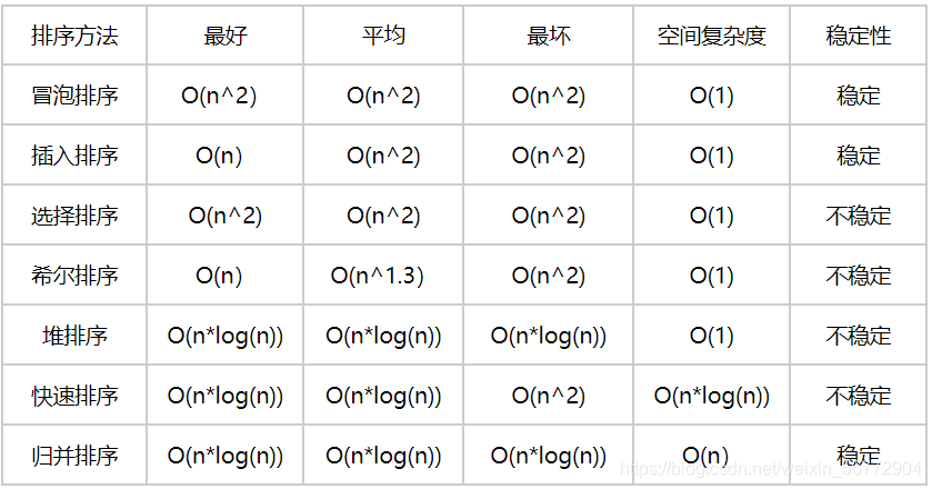 对常见排序的时间复杂度,空间复杂度以及稳定性进行归纳得出以下表格: