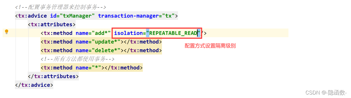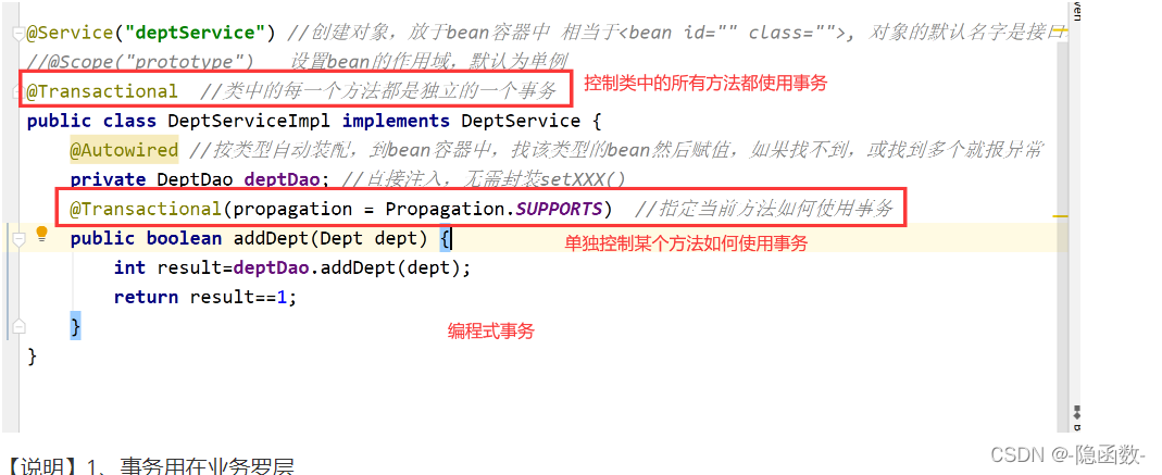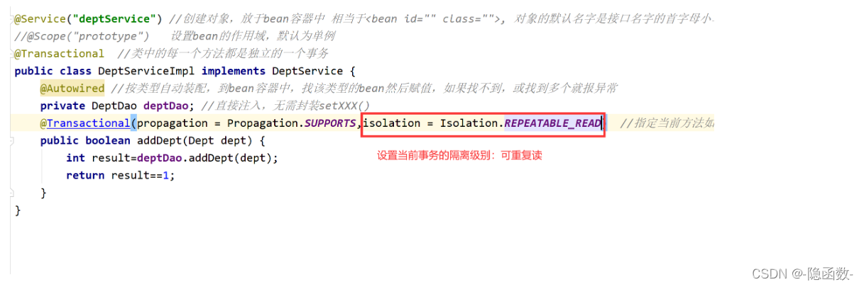 @Transactional(isolation = Isolation.DEFAULT,propagation = Propagation.NESTED,readOnly = true,timeout = -1,