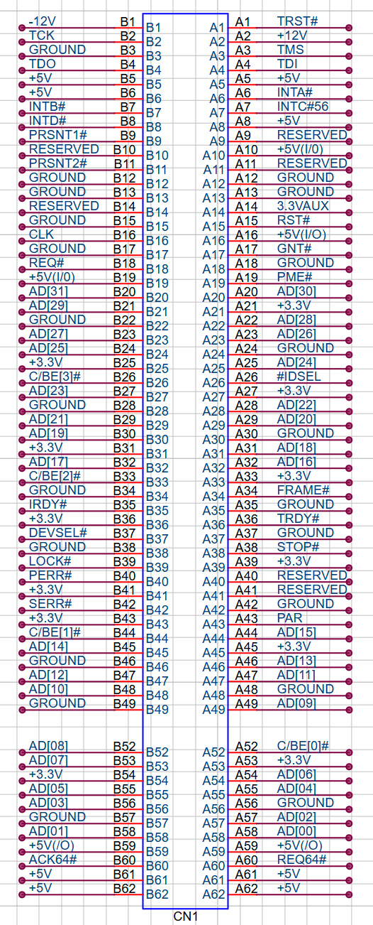 系统时钟信号,对于所有的PCI设备都是输入信号。其频率最高可达33MHz,最低频率一般为0Hz(DC),这一频率也称为PCI的工作频率。对于PCI的其它信号,除了RST#、IRQB#、IRQC#、IRQD#之外,其余信号都在CLK的上升沿有效(或采样)。