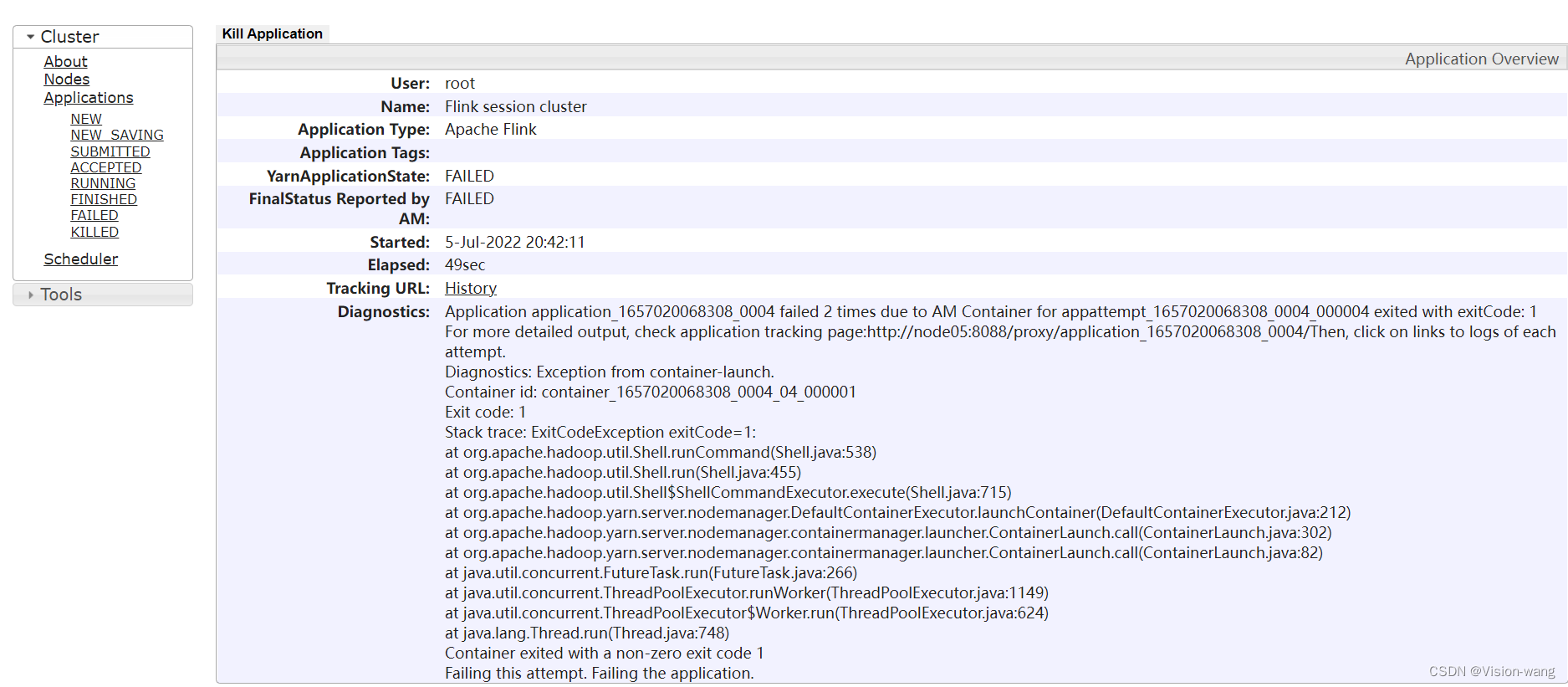 这是命令行的报错,大概意思就是容器container启动错误,为什么错没有描述清楚,详细的信息他说可以通过下面地址进行查看http://node05:8088/proxy/application_1657020068308_0004/Then