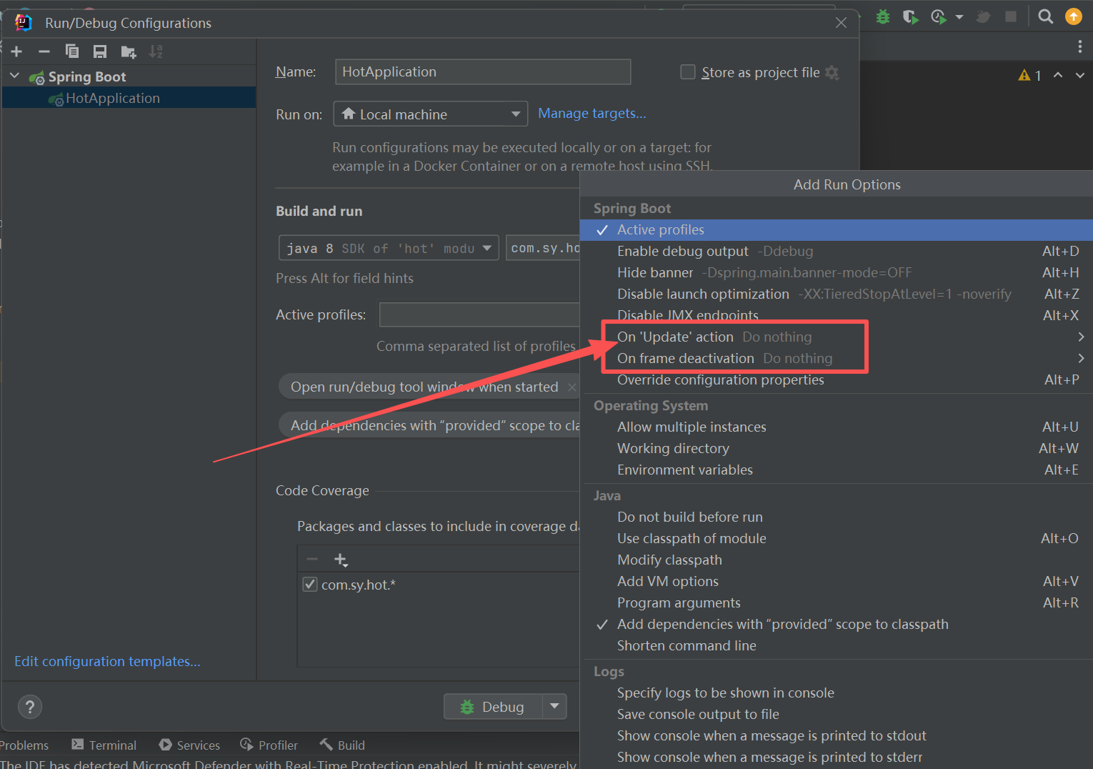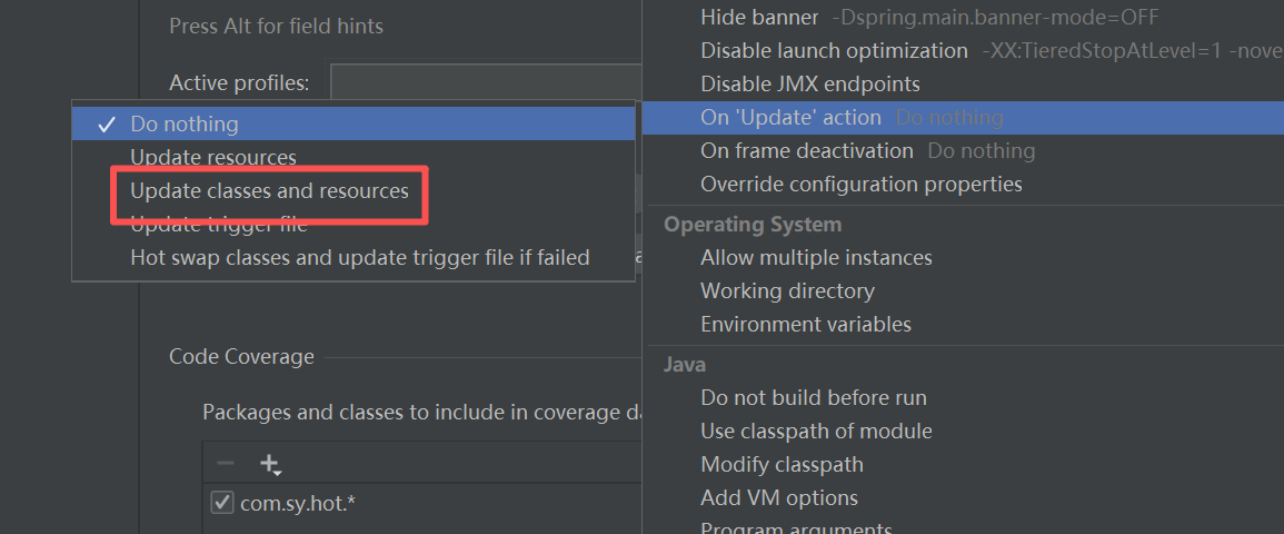 3、修改下面圈到的两个配置,单击选择update classes and resource ,两个配置都选择update classes and resource,实现热部署