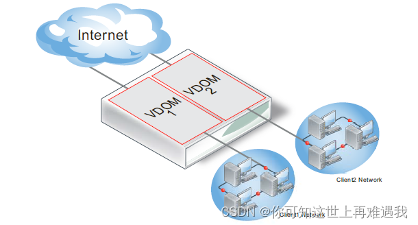 虚拟域(VDOM),可以理解为虚拟防火墙,是一种将一个RG-WALL设备分为两个或两个以上虚拟设备的技术,它能起到多个独立设备的作用。VDOM可提供单独防火墙策略,在NAT/路由模式下,它可完全分开配置,从而为各连通网络或组织提供路由或VPN服务,同时VDOM之间也可以互访。设备的系统资源可以手动分配给不同的VDOM。一般常用于需要完成独立分割的多个网络,比如云环境;由于NGFW只能切换成nat和透明的其中一种模式,所以在既有透明又有nat路由的混合环境下必须使用VDOM模式来实施