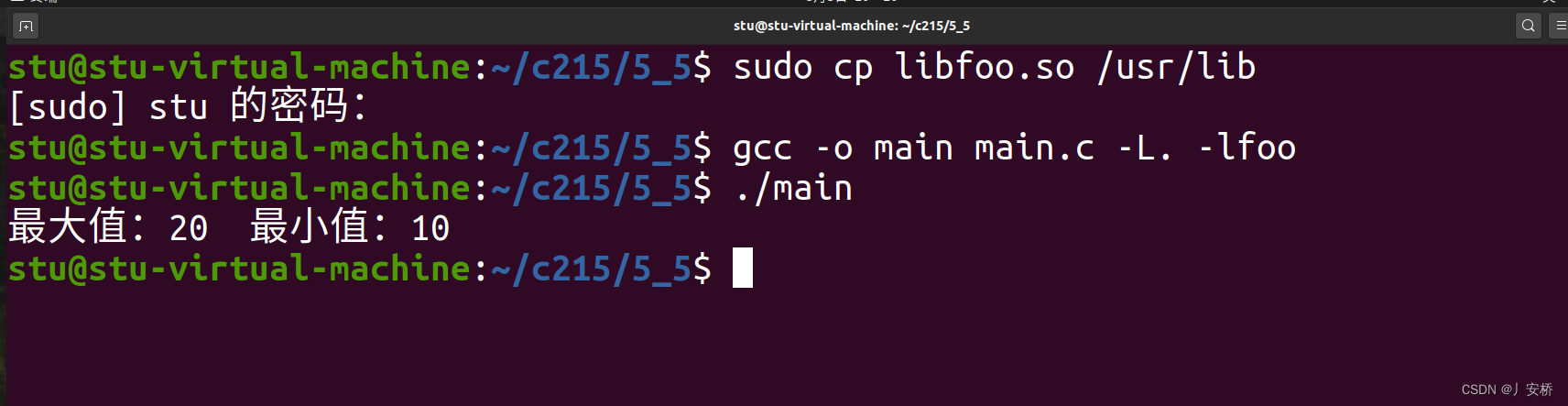 需要切换管理员权限把生成的动态库拷贝到/usr/lib下边:sudo cp libfoo.so /usr/lib