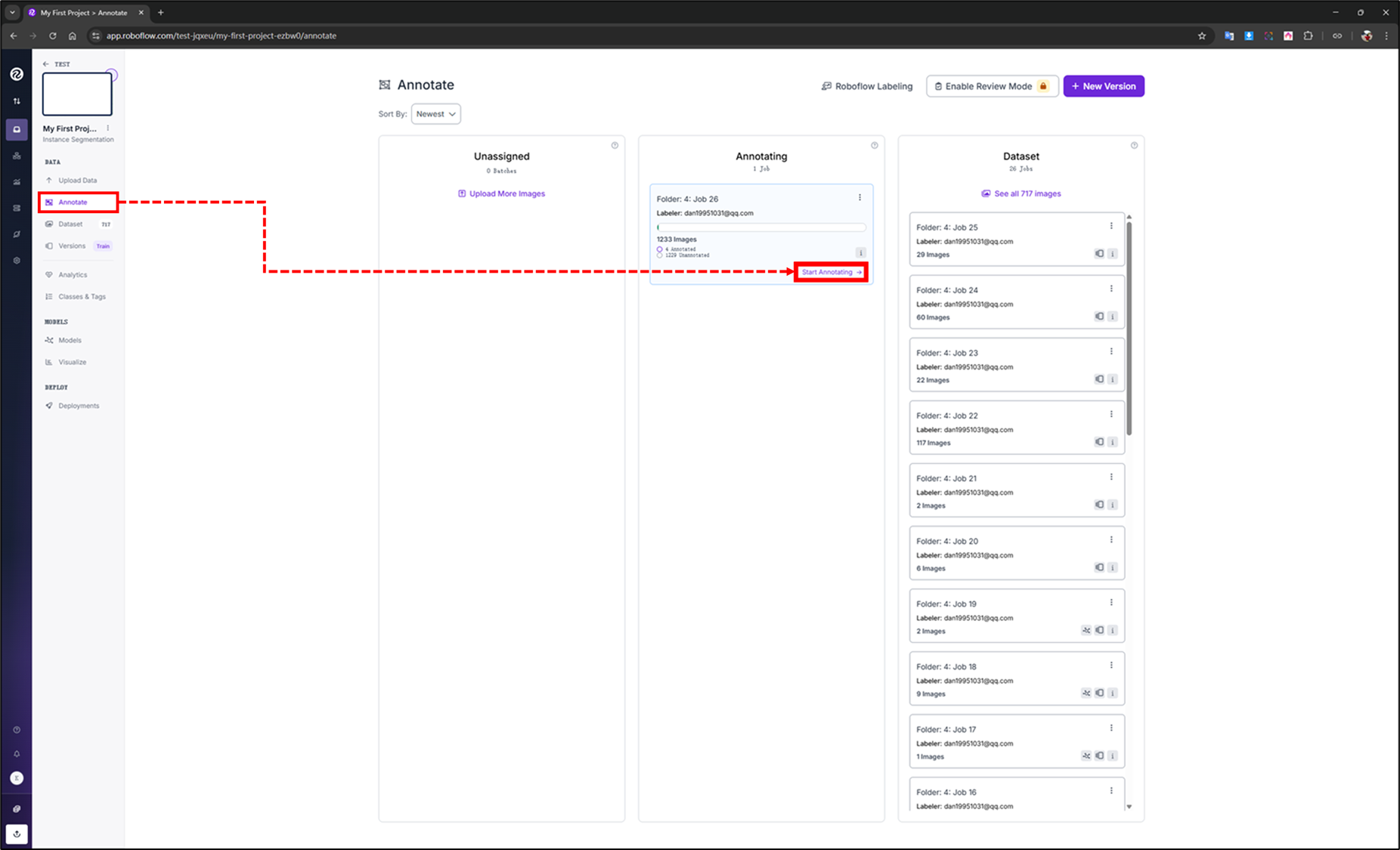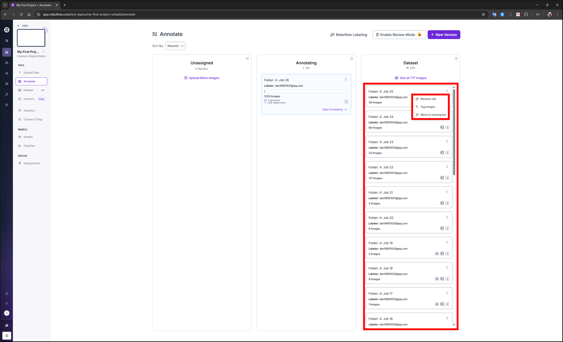 Once a batch is assigned to a user for annotation, it will appear as an annotation job in the Annotating column. Deleting images from the Annotating column will send them back to the Unassigned column as a batch.