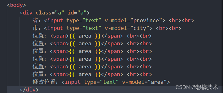 省和市通过绑定v-model事件实现数据的双向绑定,而所在位置的信息并不在data数据中,这就是所需的数据不存在,所以用到了计算属性来计算得到,当然也可以通过将数据通过插值法直接在{{ }}中写表达式实现例如{{province + '-' + city}},但是在vue中希望模板视图中尽量的简单,所以不推荐,但是这样的写法并不会报错。其次通过methods下写方法页可以实现,定义好方法后直接在视图中{{方法名()}}也可以。但是由于计算属性的缓存机制,所以优先使用计算属性方法。