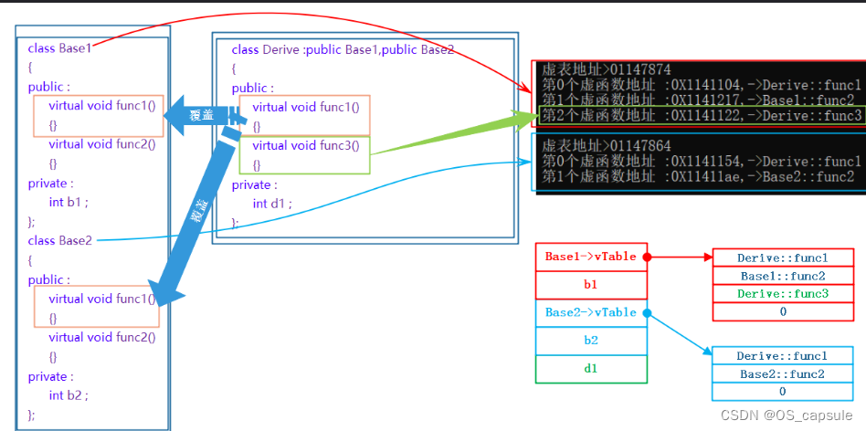 多继承情况下会存在多张虚函数表,并且子类没有重写的虚函数会放在第一个虚函数表末尾