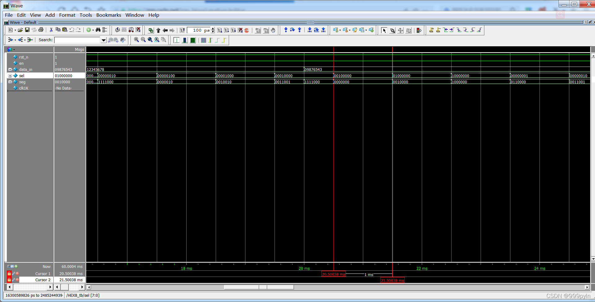 遇到了一个比较奇怪的问题,就是clk1K(分频时钟)无波形,但是sel是根据clk1K得到的,而且输出正常。这个地方不清楚是哪里的问题。但在后仿真中可以看到clk1K波形。