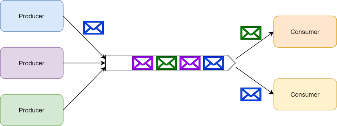 利用消息队列可以解耦生产者和消费者。多个生产者可以向同一个消息队列发送消息;但是,一个消息在被一个消息者处理的时候,这个消息在队列上会被锁住或者被移除并且其他消费者无法处理该消息。也就是说一个具体的消息只能由一个消费者消费。