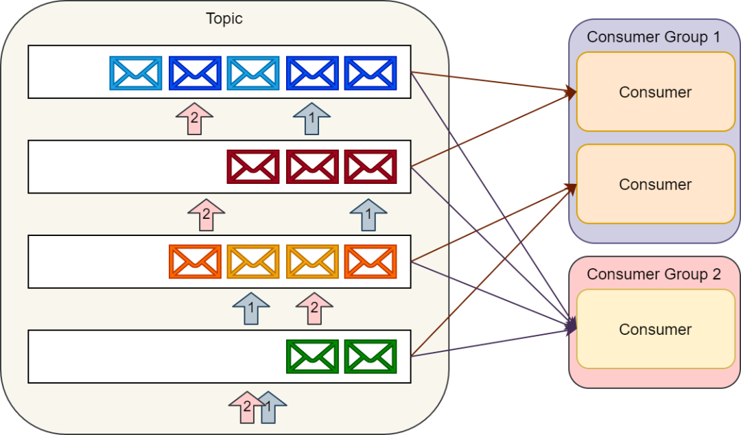生产者可以向一个具体的主题发送消息,然后多个消费者组可以消费相同的消息。每一个消费者组都可以独立的伸缩去处理相应的负载。由于消费者维护自己的分区偏移,所以他们可以选择持久订阅或者临时订阅,持久订阅在重启之后不会丢失偏移而临时订阅在重启之后会丢失偏移并且每次重启之后都会从分区中最新的记录开始读取。