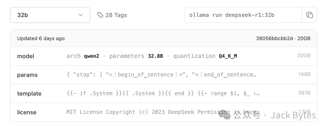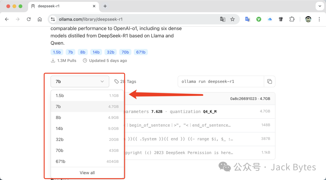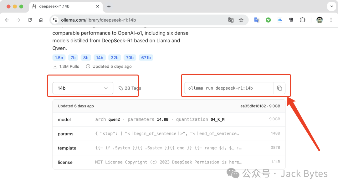 比如,我的电脑是MacOS 32G,这里我选择了14b的模型,点击14b,然后在右侧会出现下载命令: