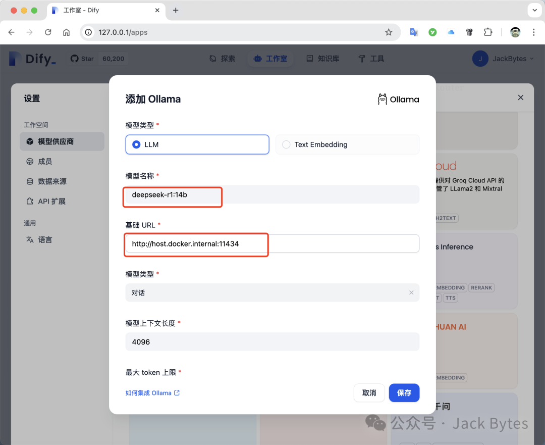 在「模型名称」中填:deepseek-r1:14b。在「基础URL中」,如果ollama和Dify是同机部署,并且Dify是通过Docker部署,那么填http://host.docker.internal:11434,其他情况填http://ollama的地址:11434,填完之后点击保存即可。