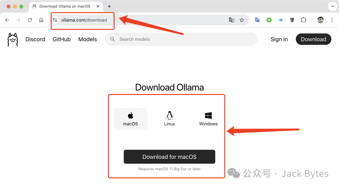 进入到ollama官网,选择对应的操作系统,下载ollama应用程序并安装:
