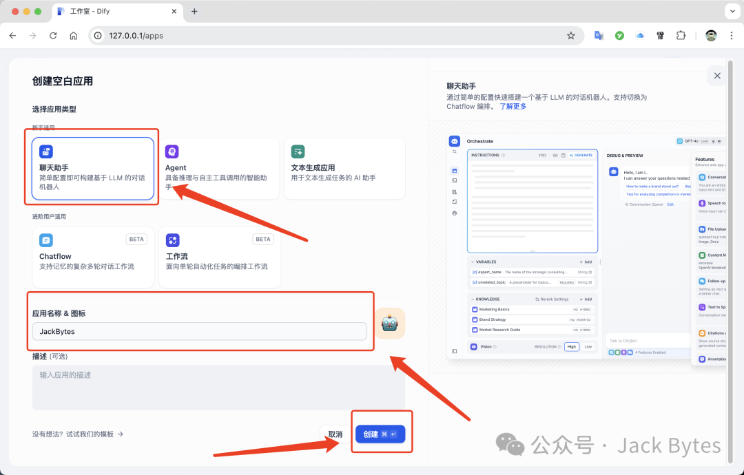 在弹出的窗口中选择「聊天助手」,填写「应用名称」和「描述」,然后点击创建:
