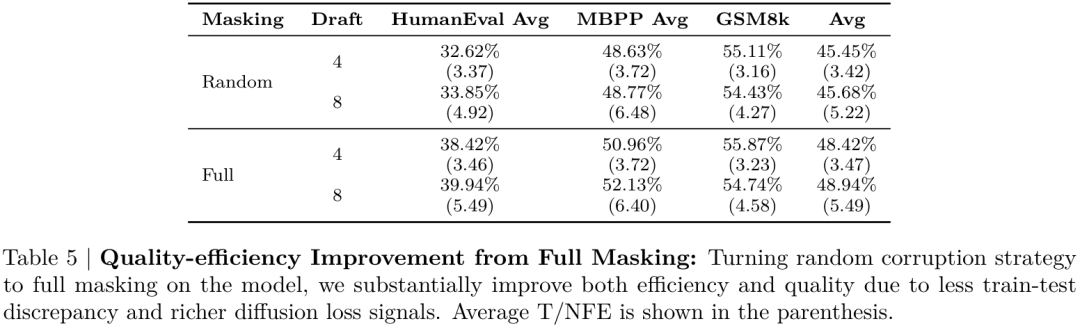 此外,一个有趣的设计是“完全掩码”(Full Mask)策略。在训练扩散部分时,TiDAR不提供任何“干净”的上下文提示,而是全部使用[mask]标记。这不仅减少了训练与推理的差异,还增强了扩散损失信号,从而显著提升了模型的效率和质量。