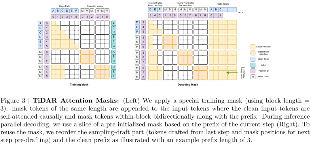 这听起来有点不可思议,但通过精心设计的注意力机制,TiDAR做到了。研究者们设计了一种特殊的结构化注意力掩码(structured attention masks),使得模型在处理序列时,不同部分能采用不同的注意力模式。