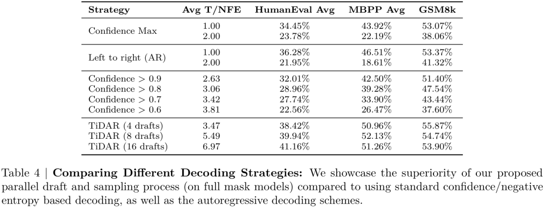 论文还通过消融实验证明了其核心设计的有效性。例如,实验证明TiDAR提出的并行草稿与采样机制,远优于传统的基于置信度的解码策略。