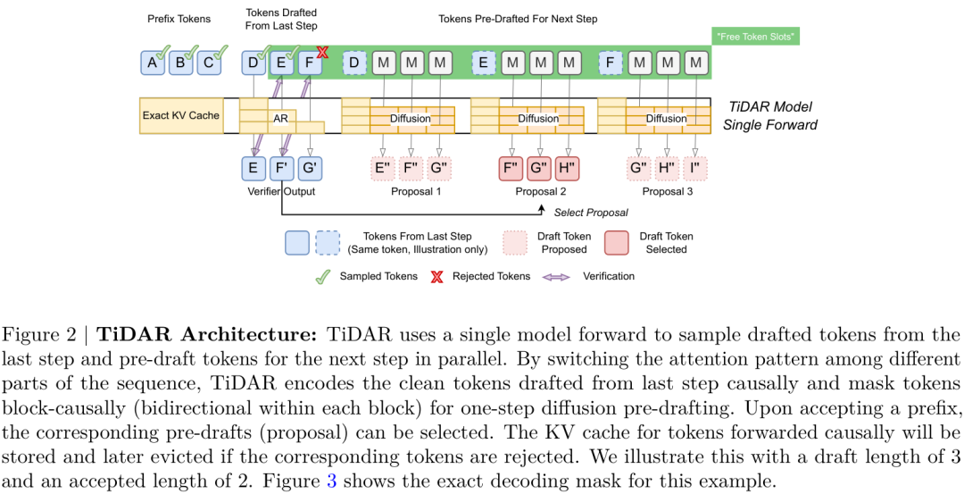 TiDAR的核心思想非常精妙:在一个模型、一次前向传播(forward pass)中,同时完成两件事——用扩散模式“思考”草稿,用自回归模式“确认”输出。