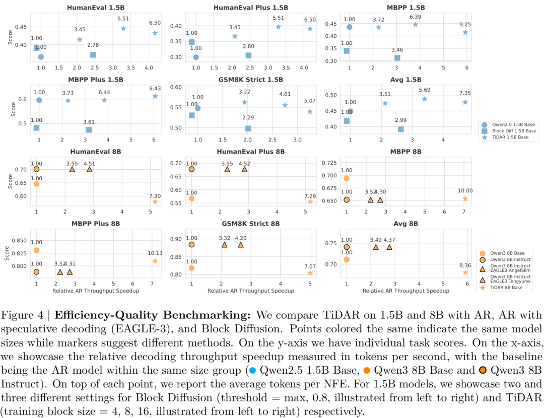可以看到,TiDAR(图中星形和圆形标记)在各个模型尺寸下,都达到了一个非常优秀的“帕累托前沿”——即在相似的质量水平下,它的速度最快;在相似的速度水平下,它的质量最高。
