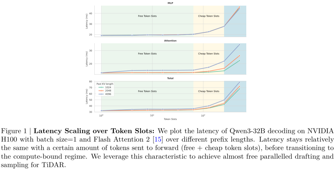 这种设计的巧妙之处在于,它充分利用了现代GPU在处理少量token时存在的“免费计算区间”(free token slots)。如下图所示,当序列长度在一定范围内增加时,推理延迟几乎不变。TiDAR正是将并行思考(草稿生成)和串行表达(验证)打包在这一次计算中,把这部分“免费”的算力给用上了。
