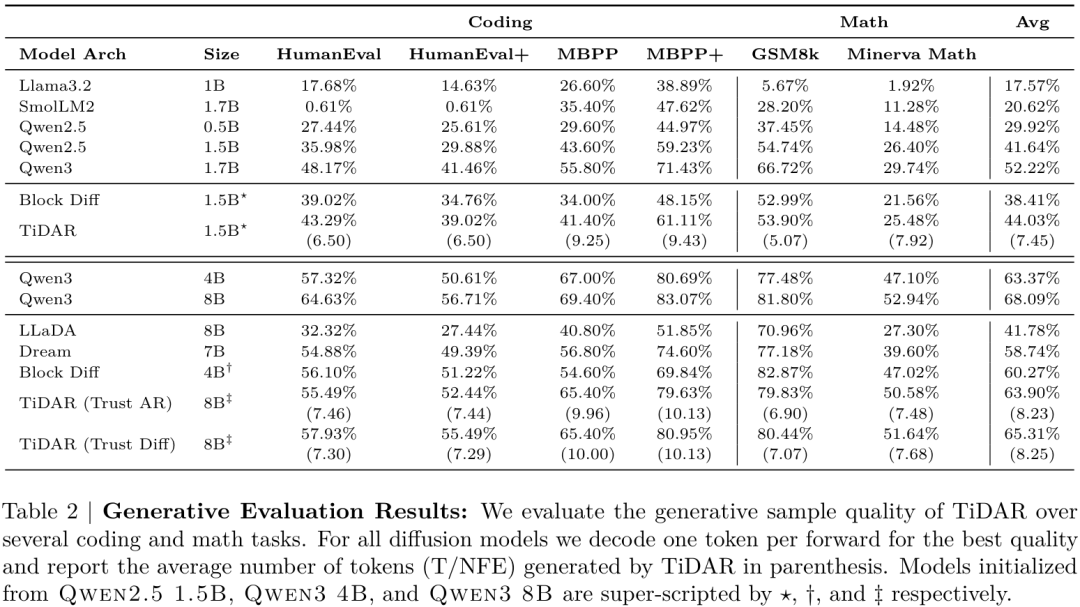 在代码生成(HumanEval, MBPP)和数学推理(GSM8K, Minerva Math)等生成任务上,TiDAR的表现同样出色。如下表所示,TiDAR 1.5B的性能全面看齐甚至超越了Qwen2.5 1.5B AR模型。而TiDAR 8B也与Qwen3 8B AR模型性能相当,远超同等规模的其他扩散模型(如LLaDA, Dream)。