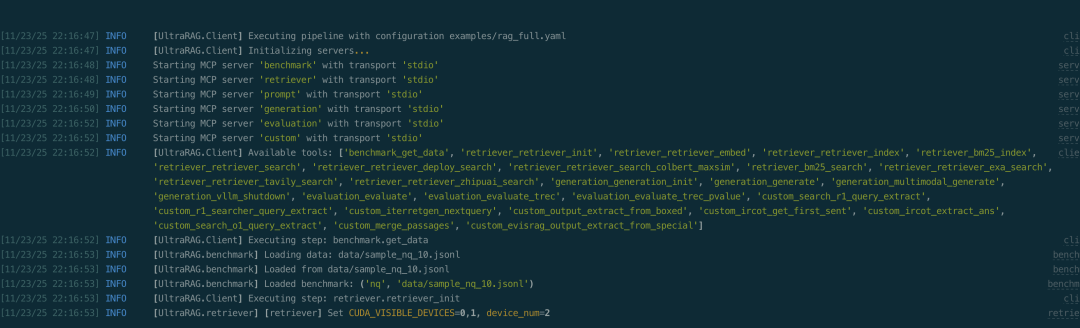 pipeline定义各 Server 中功能函数(Tool)的调用顺序。本示例展示了从数据加载、检索编码与索引构建,到生成与评测的完整流程。