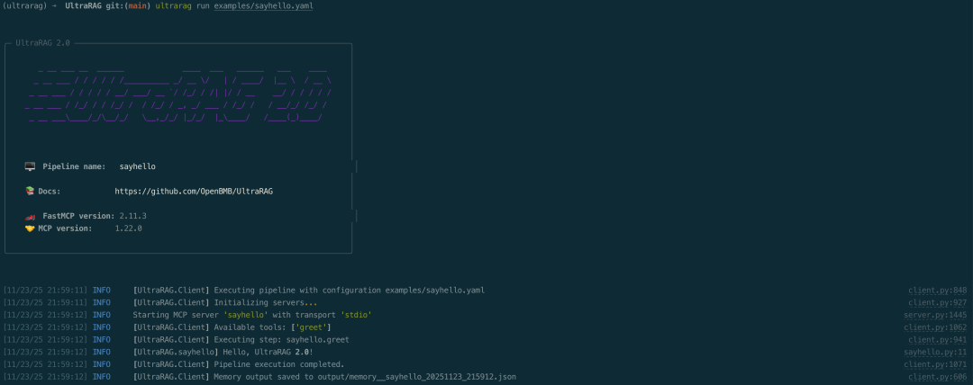 # 成功运行显示'Hello, UltraRAG 2.0!' 欢迎语