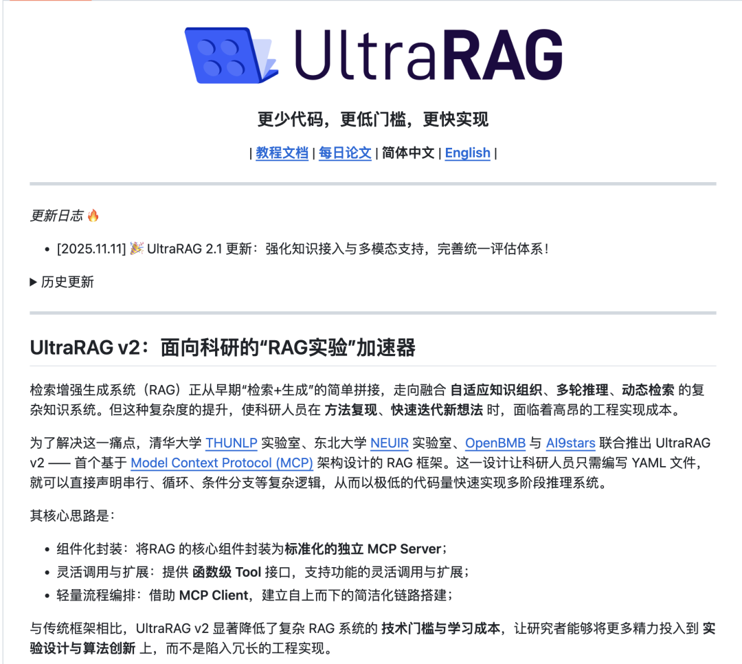 UltraRAG 的开源项目是首个基于 MCP 的检索增强生成(RAG)框架,不写代码也能玩转。