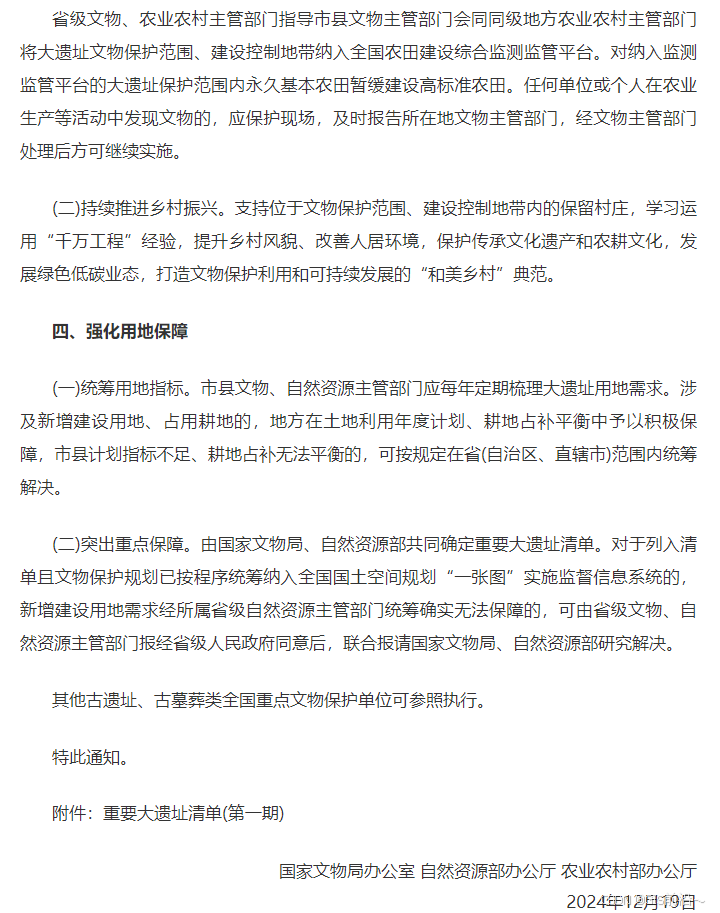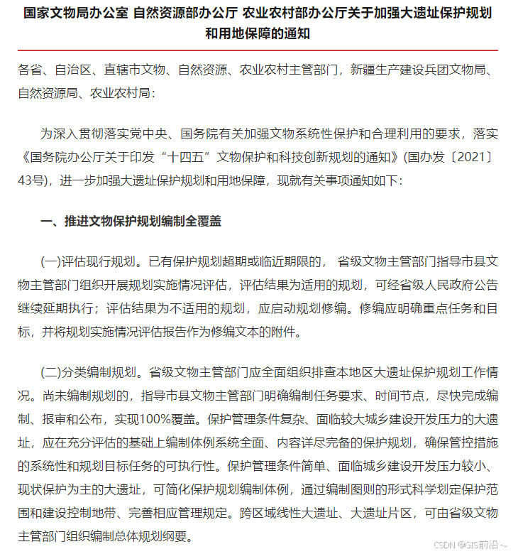 为深入贯彻落实党中央、国务院有关加强文物系统性保护和合理利用的要求,落实《国务院办公厅关于印发“十四五”文物保护和科技创新规划的通知》(国办发〔2021〕43号),国家文物局办公室 自然资源部办公厅 农业农村部办公厅联合发布关于加强大遗址保护规划和用地保障的通知,进一步加强大遗址保护规划和用地保障,具体内容如下: