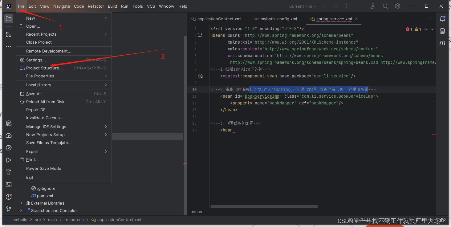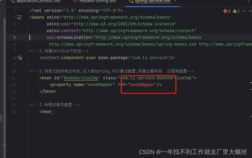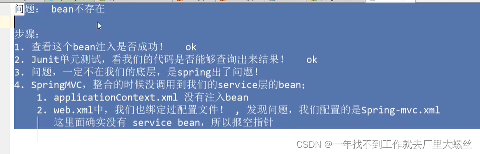 因为我们web.xml中关联spring配置文件的时候我们关联的是一部分配置文件,没有关联到总的配置文件