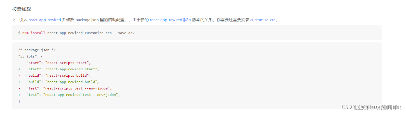 3.1引入 react-app-rewired 并修改 package.json 里的启动配置。。由于新的 react-app-rewired@2.x 版本的关系,你需要还需要安装 customize-cra。