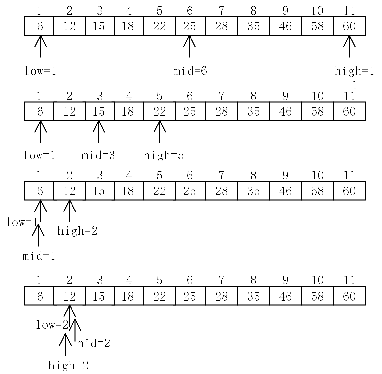 举例:列表中有11个元素(6,12,15,18,22,25,28,35,46,58,60),给出使用折半查找法查找12的过程。