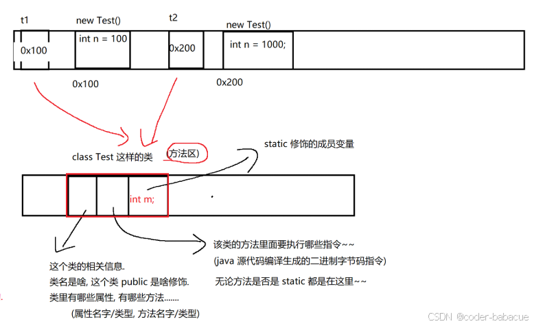 JVM中有一个专门的内存空间,称为“方法区",一个类中的方法,都是只在内存中有一份的.被所有的对象共用.