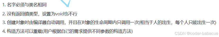 构造方法(也称为构造器)是一个特殊的成员方法,名字必须与类名相同并且不能有返回值,在创建对象时,由编译器自动调用,并且在整个对象的生命周期内只调用一次。