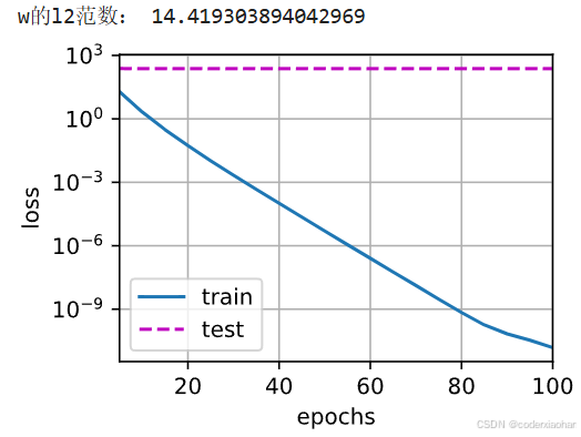 我们现在用lambd = 0禁用权重衰减后运行这个代码。 注意,这里训练误差有了减少,但测试误差没有减少, 这意味着出现了严重的过拟合。
