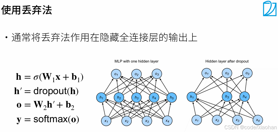 我们可以将暂退法应用于每个隐藏层的输出(在激活函数之后), 并且可以为每一层分别设置暂退概率: 常见的技巧是在靠近输入层的地方设置较低的暂退概率。 下面的模型将第一个和第二个隐藏层的暂退概率分别设置为0.2和0.5, 并且暂退法只在训练期间有效。
