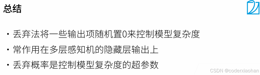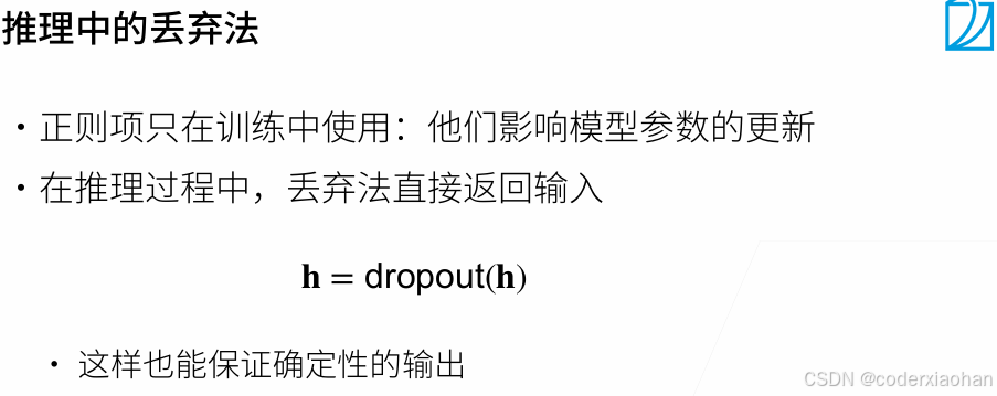 dropout只用于全连接层,不用于卷积层,同时在推理过程中,不使用丢弃法和正则,因为推理时想要得到确定的输出。而每次随机dropout,最后ensemble(取平均)。在推理时,网络的神经元并没有被丢弃