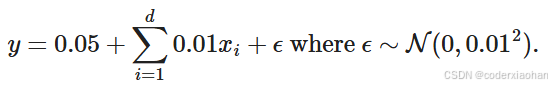 我们选择标签是关于输入的线性函数。 标签同时被均值为0,标准差为0.01高斯噪声破坏。 为了使过拟合的效果更加明显,我们可以将问题的维数增加到d=200,并使用一个只包含20个样本的小训练集。