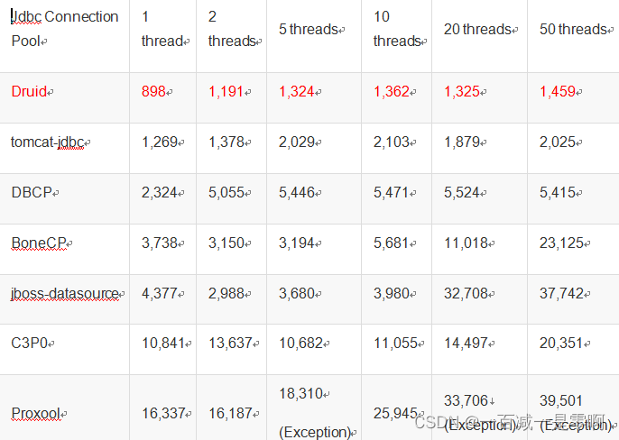 结论(数据和结论来自阿里druid团队) Druid是性能最好的数据库连接池,tomcat-jdbc和druid性能接近。 proxool在激烈并发时会抛异常,完全不靠谱。 c3p0和proxool都相当慢,慢到影响sql执行效率的地步。 bonecp性能并不优越,采用LinkedTransferQueue并没有能够获得性能提升。 除了bonecp,其他的在JDK 7上跑得比JDK 6上快 jboss-datasource虽然稳定,但是性能很糟