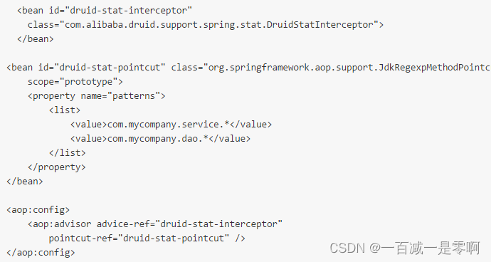 com.alibaba.druid.support.spring.stat.DruidStatInterceptor是一个标准的Spring MethodInterceptor。可以灵活进行AOP配置。