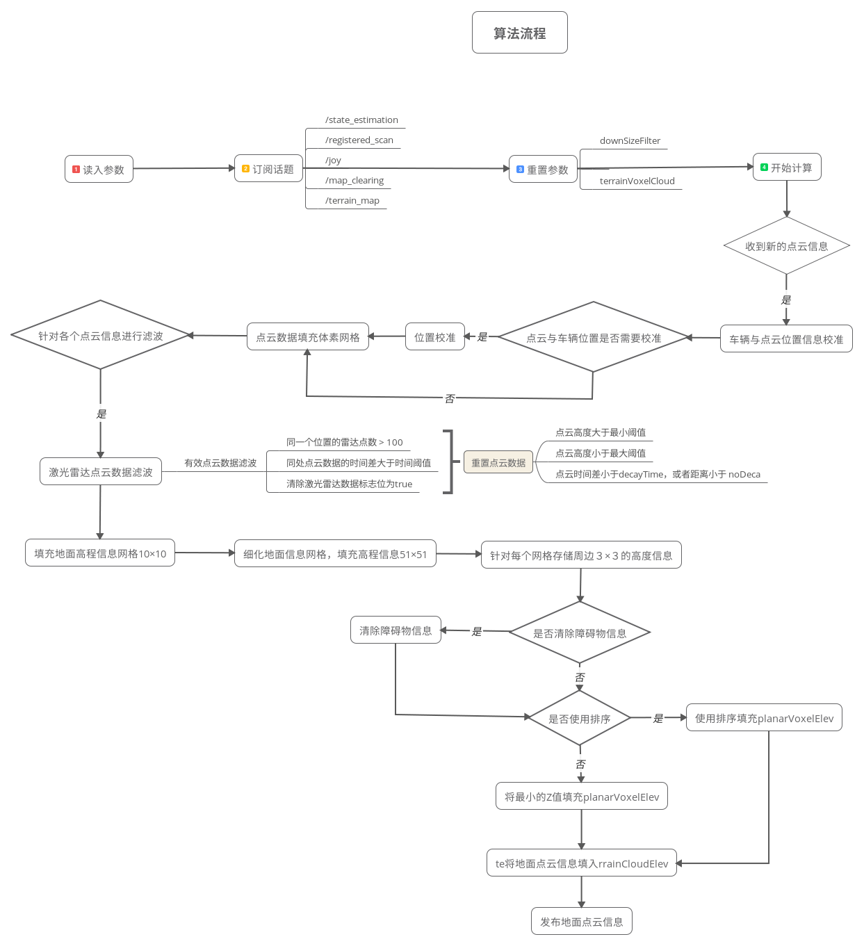 terrain_analysis是一种进行地面点云分割的算法,其主要的程序流程如下图。
