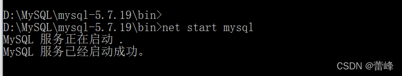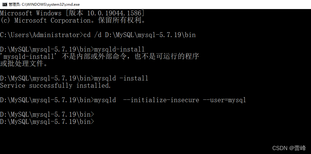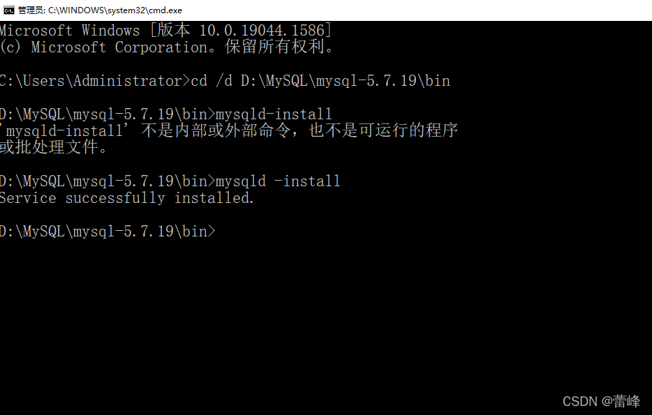 11.打开命令提示符,通过cd /d跨盘符切换到该文件的bin目录下,在bin目录下输入mysqld -install,显示安装成功,即成功了。