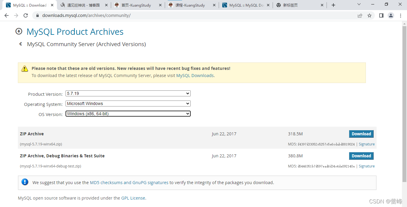 4.我们选择5.7.19版本,同时选择windows系统,同时根据自己电脑进行下载64位还是32位,在下载过程中,我们尽量采用下载压缩包的方式进行安装,而不是采用.exe的方式进行安装,否则后续在卸载的时候会特别麻烦,当然了,如果删不干净,可以采用geek这个卸载软件进行删除。