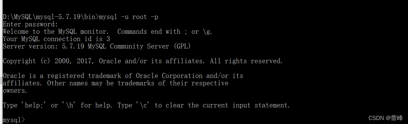 13.然后再次启动mysql,再命令提示符下的该文件的bin目录下输入net start mysql,然后用命令mysql -u root -p进入mysql管理界面(密码可为空,-p后面不要加空格)出现enter password,之后,我们不要设置密码,直接回车即可。如果没有出来enter password,我们可以再输一遍mysql -u root -p,如果还不行,可以把my.ini文件的最后一行注释掉即可,及前面加一个#即可。