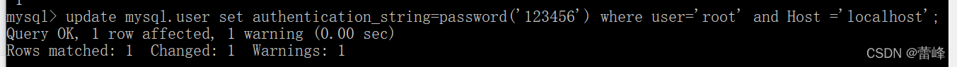 14.进入界面后更改root密码。即输入update mysql.user set authentication_string-password('123456') where user='root' and Host='localhost';(切记不可少了分号)如果版本比这个高的话,即为8.0版本的为ALTER USER 'root'@'localhost' IDENT IFIED BY '123456';即密码改为123456.用户名改为root.