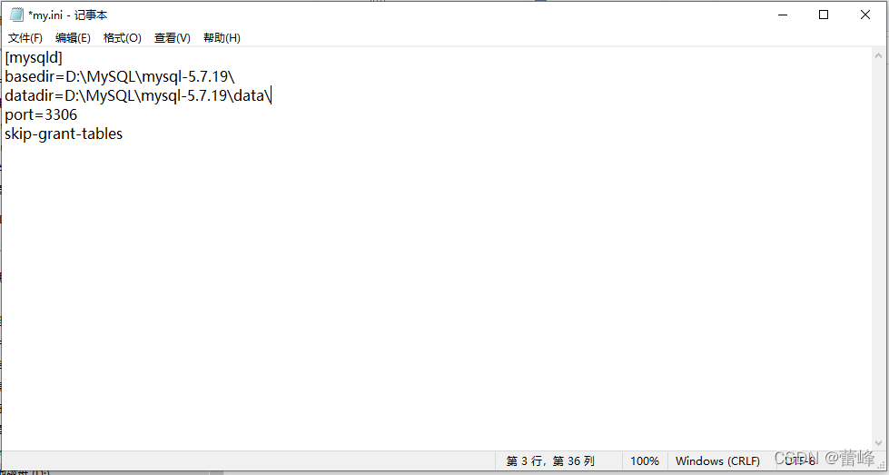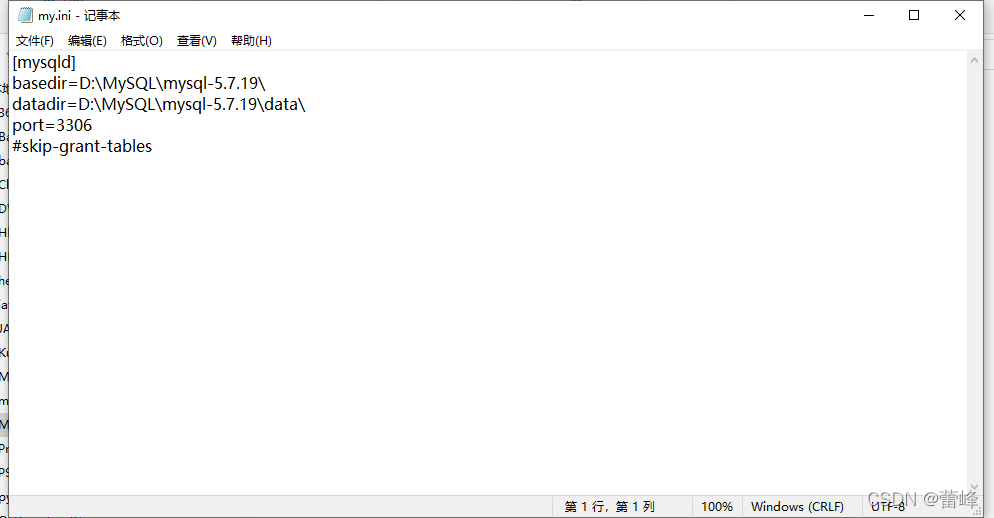 16.如果在进入mysql管理界面正常进入后,我们在完成这些之后将my.ini文件的最后一行注释掉,即前面加个#即可。