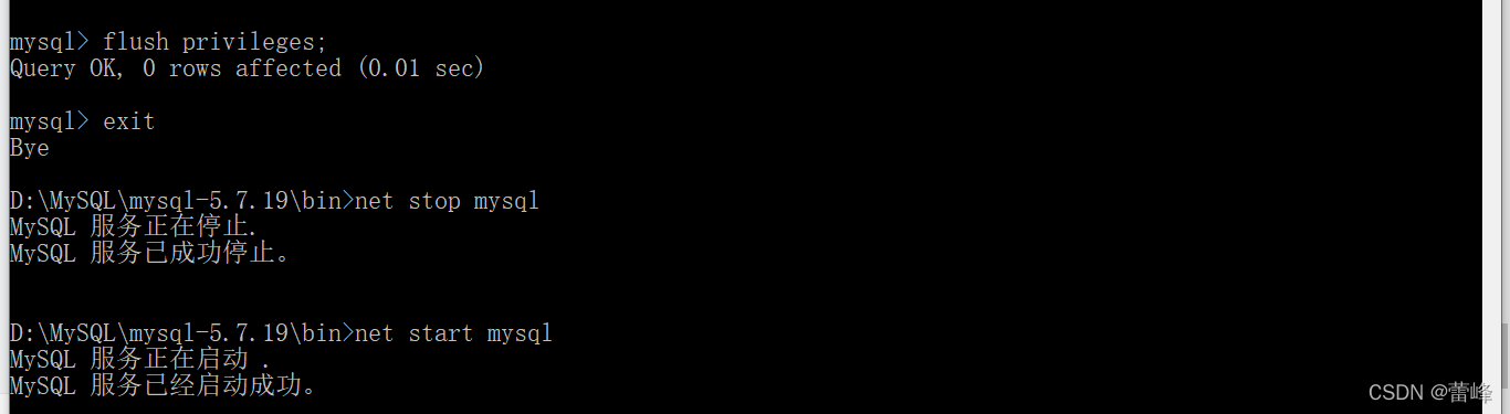 17.先退出mysql,即exit.之后重启mysql就可以正常使用了。即输入net stop mysql,先停止,再重启。net start mysql.