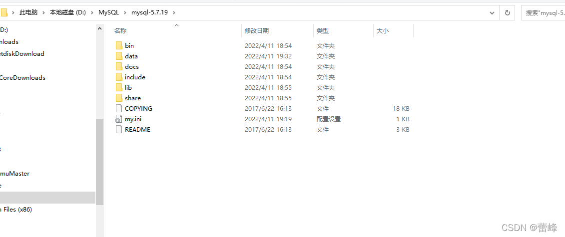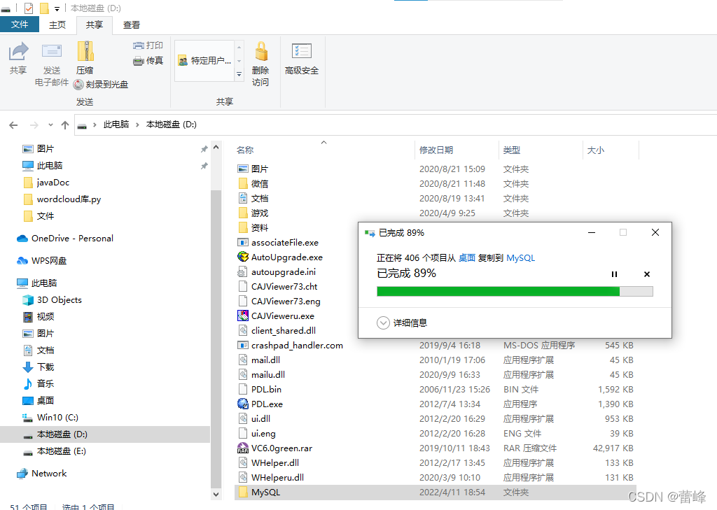 6.我们将该文件移动到D盘,设置文件名称为MySQL,以便于后续的操作,便捷找到,同时,可以把所下载的关于JAVA的软件全部放置到D盘里面.