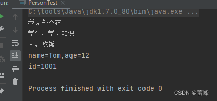 package com.hy; /** * super关键字的使用: * 1.super理解为:父类的 * 2.super可以用来调用,属性、方法、构造器。 * 3.super的使用,调用属性和方法 * 3.1我们可以在子类的方法或构造器中,通过使用“super.属性”或“super.方法”的方式,显式的调用父类中声明的属性或方法, * 但是,通常情况下,我们习惯省略““super.” * 3.2特殊情况:当子类和父类中定义了同名的属性时,我们要想在子类中调用父类中声明的属性,则必须显式的使用“super.属性”的 * 方式,表明调用的是父类中声明的属性。 * 3.3特殊情况:当子类重写了父类中的方法以后,我们想在子类的方法中调用父类中被重写的方法时,则必须显式的使用“super.方法” * 的方式,表明调用的是父类中被重写的方法。 * 4.super调用构造器 *4.1我们可以在子类的构造器中显式的使用“super(形参列表)”的方式,调用父类中声明的构造器 *4.2“super(形参列表)”的使用,必须声明在子类构造器的首行! *4.3我们在类的构造器中,针对于“this(形参列表)”或“super(形参列表)”只能二选一,不能同时出现 *4.4在构造器的首行,没有显式的声明“this(形参列表)”或“super(形参列表)”,则默认调用的是父类中空参的构造器:super() *4.5在类的多个构造器中,至少有一个类的构造器中使用了“super(形参列表)”,调用父类中的构造器 */ public class PersonTest { public static void main(String[] args) { Student student = new Student("it"); student.study(); Student s1 = new Student("Tom", 12, "计算机"); s1.show(); } }运行之后如下所示: