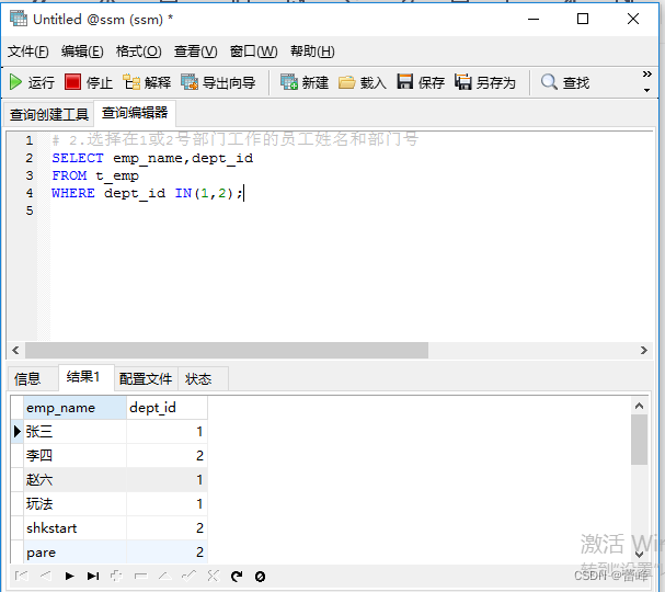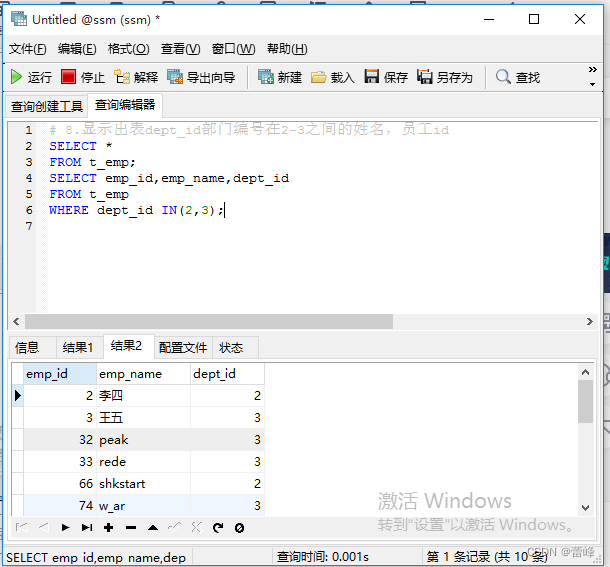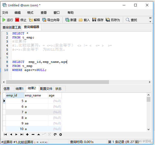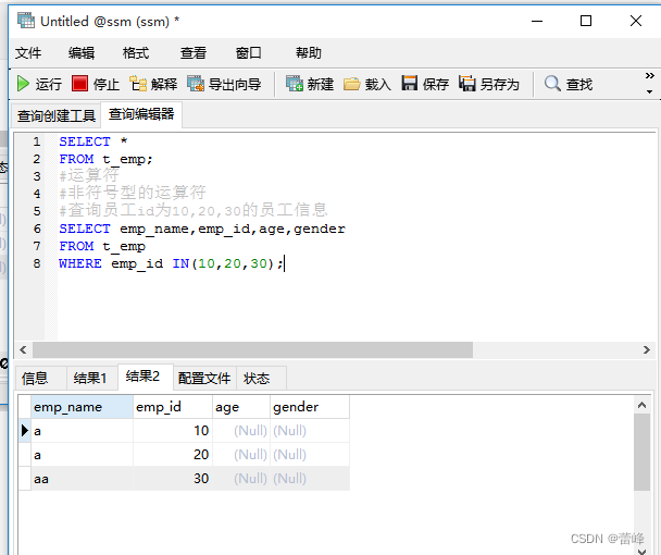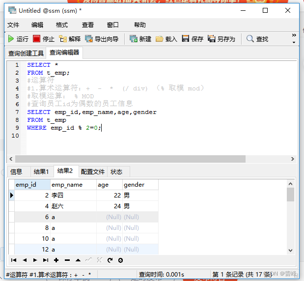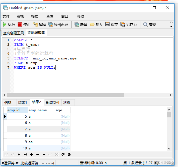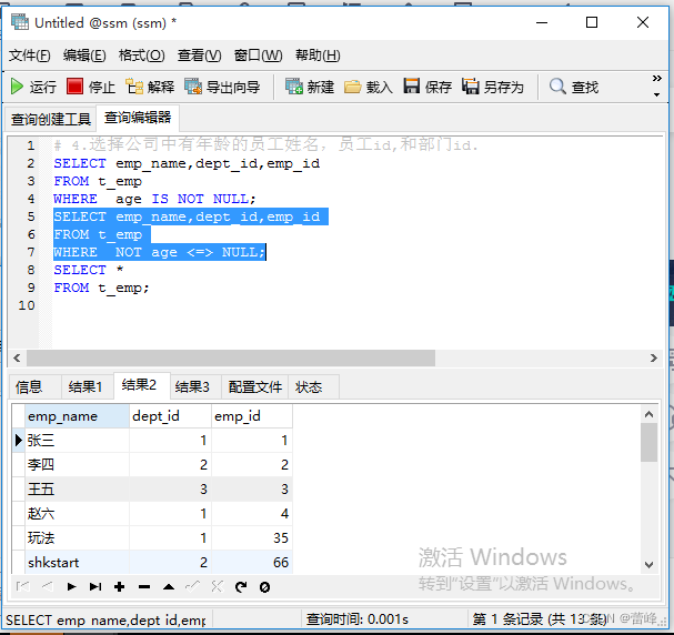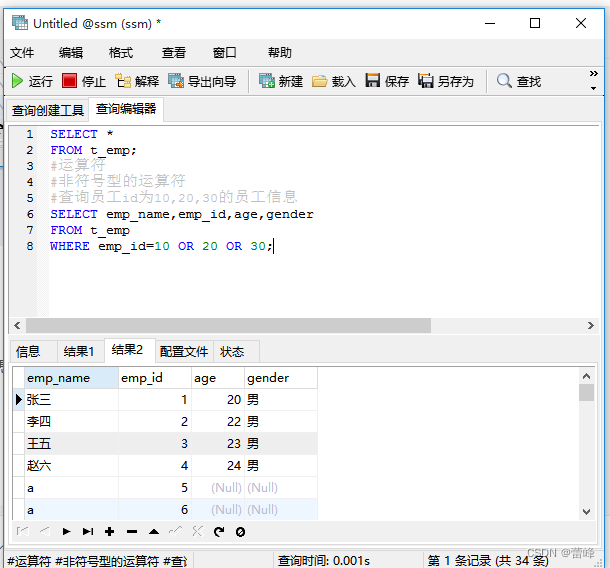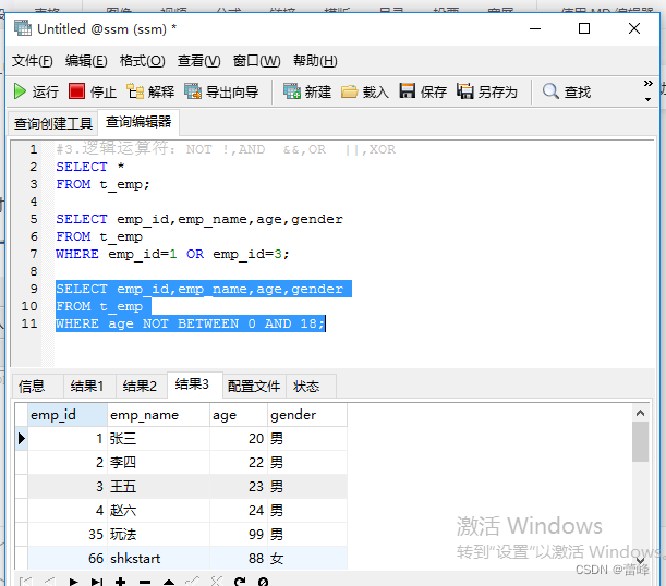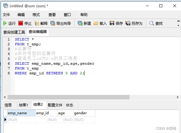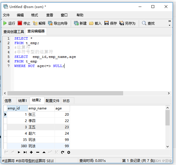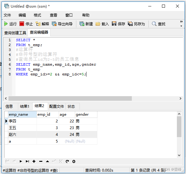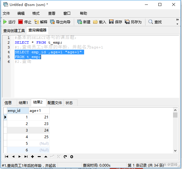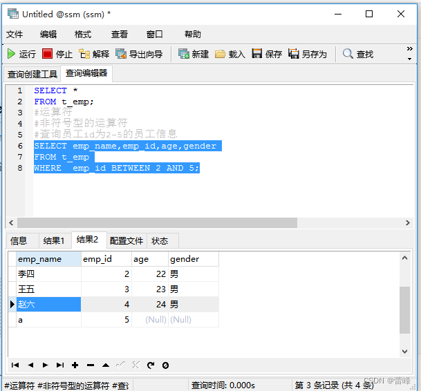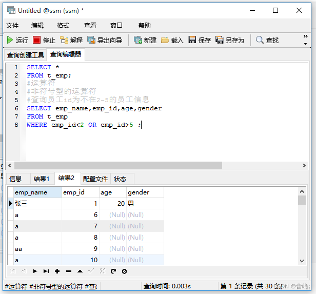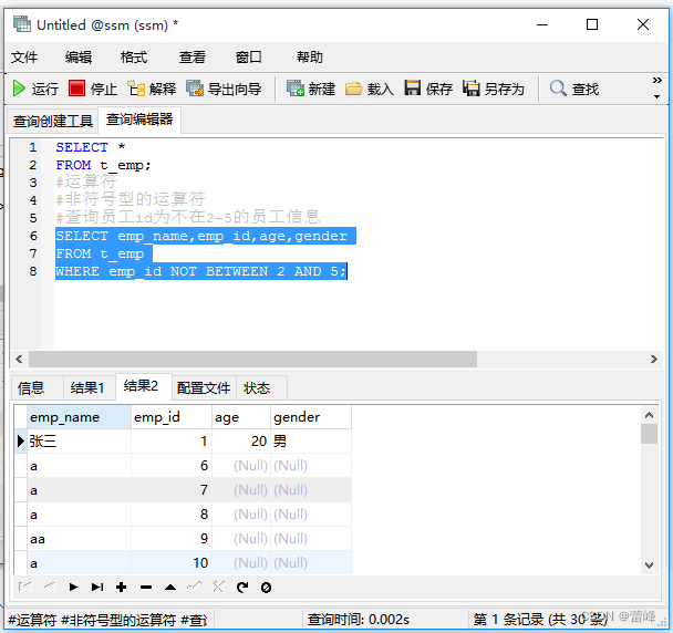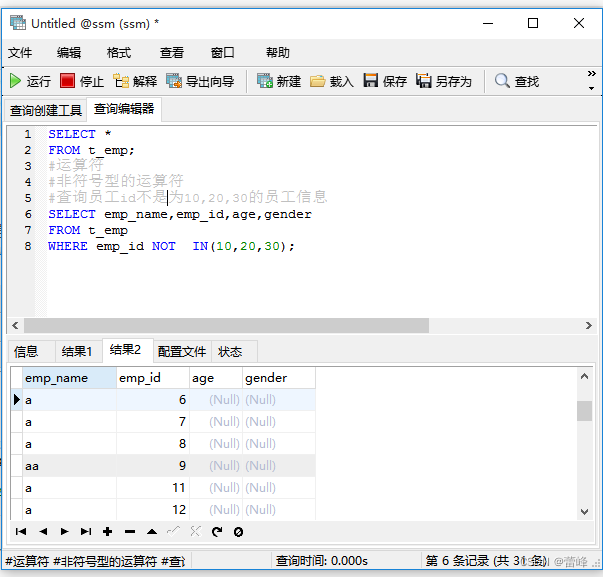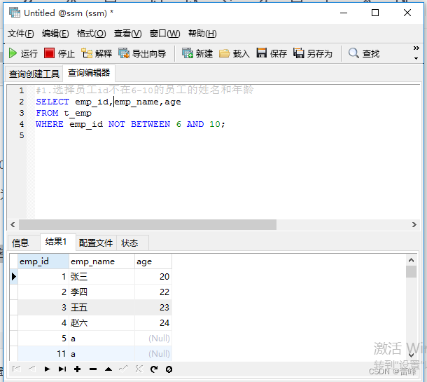 1.选择员工id不在6-10的员工的姓名和年龄: